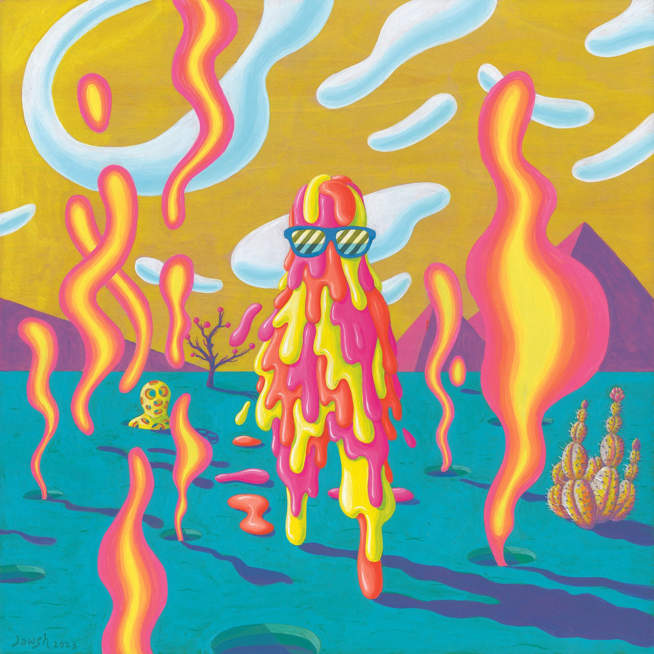 I construct vibrant, pop-surreal depictions of introspection through a recurring alter ego, called Melting Man, to navigate and address contemporary issues related to global warming, mental health, and digital overload. With this existential, abstract avatar as a focal point, I render scenes and portraits that explore a physical reality growing more unstable, and a virtual landscape that is both alluring and alienating. Polymorphic, and comprised of amorphous blobs, Melting Man has various states of being, both conceptually and in the mediums I work with, which can range from acrylic paints to eco-friendly materials such as ink, paper, wax, wood and cotton. My art is a quest to unlock creative potential, overcome self doubt, and transform dread and stress into an alchemy of colorful meditations for an uncertain future.
