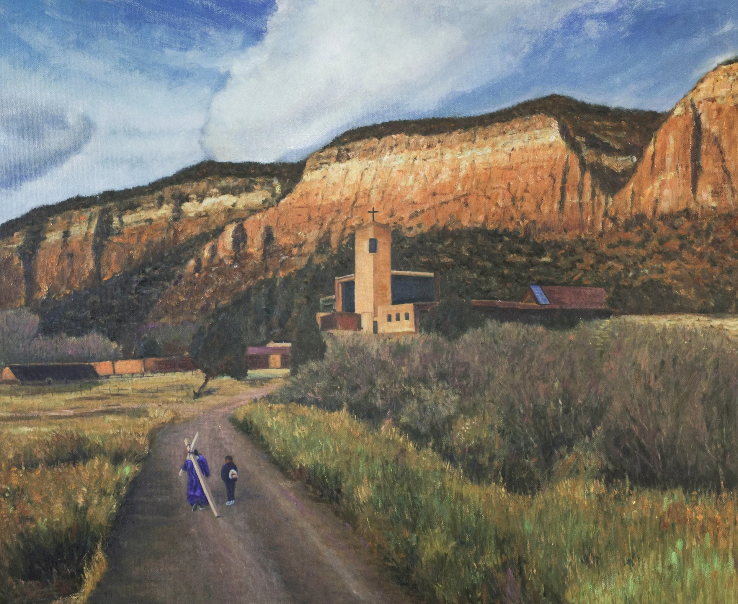The pilgrims and church in mountains, oil on linen, 120x100 cm, 2025