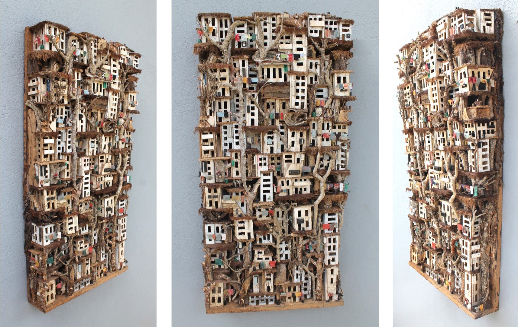 During many travels all over the world, I got fascinated by the variety of things people build in different countries to live, work or pray in. Thus the subject of Habitats became my main subject. I will never represent inhabitants, that would be too illustrative. Not wanting to make ghost towns, I use laundry lines and parts of demolished computers for pots, pans and electrical equipment to suggest people are living there. When in 2012 my wife and I emigrated from Holland to the Caribbean Island of Bonaire, this island turned out to be heaven where it comes to finding natural materials. Especially pieces of driftwood that are constantly washed ashore offer great opportunities to create rocky landscapes on which colorful houses are built. I use branches for trees; palm tree leaves for roofs and other parts of palm trees like roots in many of my Habitats. Even after 16 years of making Habitats I am still struck by the endless range of possibilities this subject offers and how often what I find in nature is a precious source of inspiration. There have been periods when I wondered wetter or not, I was making ‘More of the same’, but it always turned out there were still aspects to investigate and experiment with that I did not pay attention to yet. Like most colleague artists I have periods with little or no inspiration, but by now I know it is just a matter of time before getting a new idea.