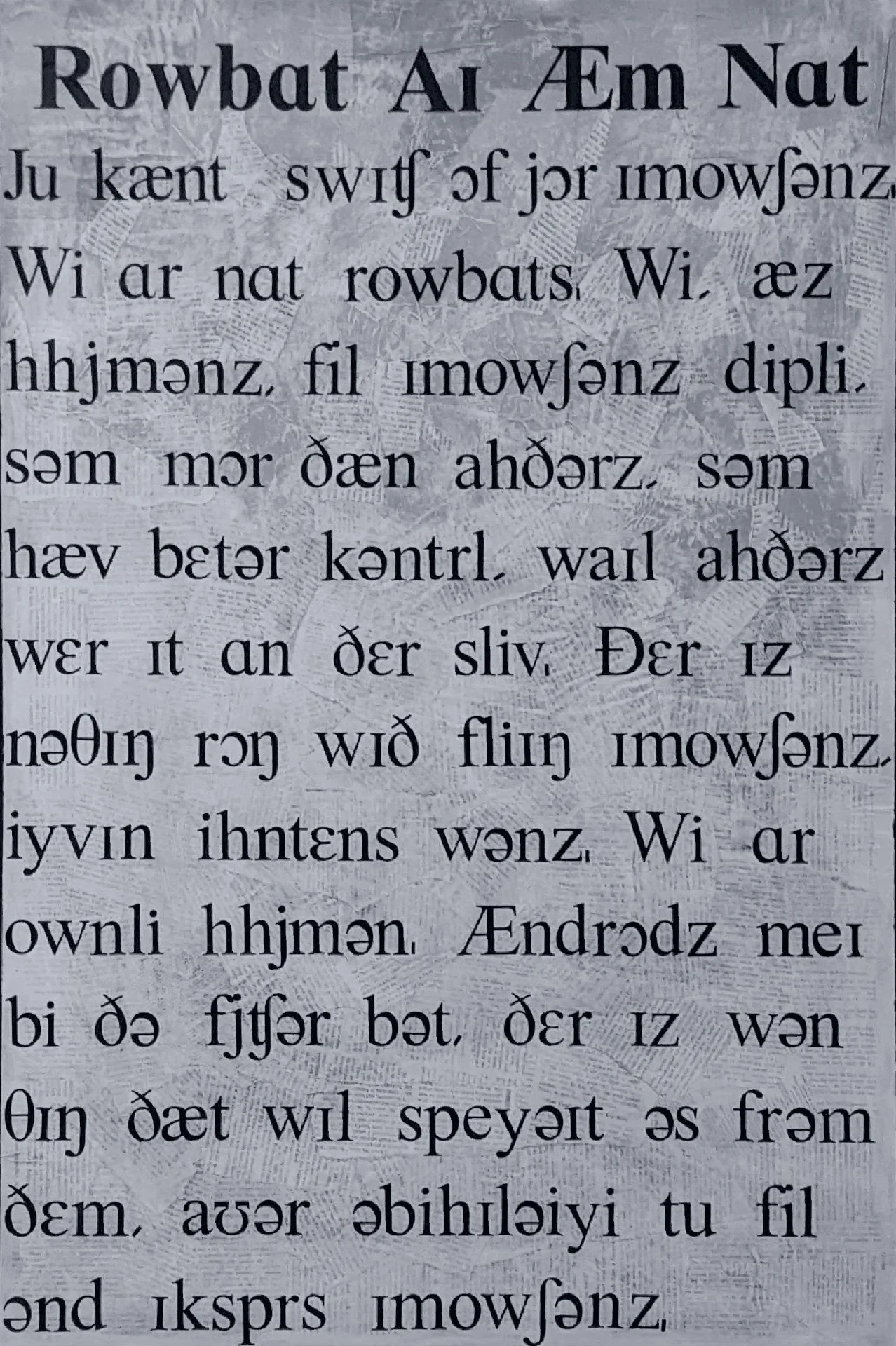 To read or not to read; that is the question. As a dyslexic artist, reading written text is difficult. I pose a question for the viewers: What if the English Language were seen through a phonetic lens? This paradoxical idea seems outlandish as the English Language is not phonetic. As we all know, this language is known for creating rules for spelling and grammar yet conveniently has words exempted from said rules. Why have them to begin with? The English Language is exposed here for its all-consuming combination of other languages that is frequently inconsistent and contradicting itself. It is no wonder other dyslexic individuals and non native speakers have trouble with this language. Poetry has an interesting dichotomy of conveying personal emotions while staying private in the public eye. Frilly language and deep symbolism touch the core of human emotions. This pulls at the reader's heartstrings as they relate to the written text. My poems are written in phonetic English, thus engaging the viewers to struggle to read. Patience is key for the viewer to maintain as they attempt to finish reading the poem before they give up and move on. This coded language plays with my ability to share deep emotions from afar. If the viewer is determined to decode the message, then they will be able to interpret the artwork at hand. So, please slow down and sound it out.