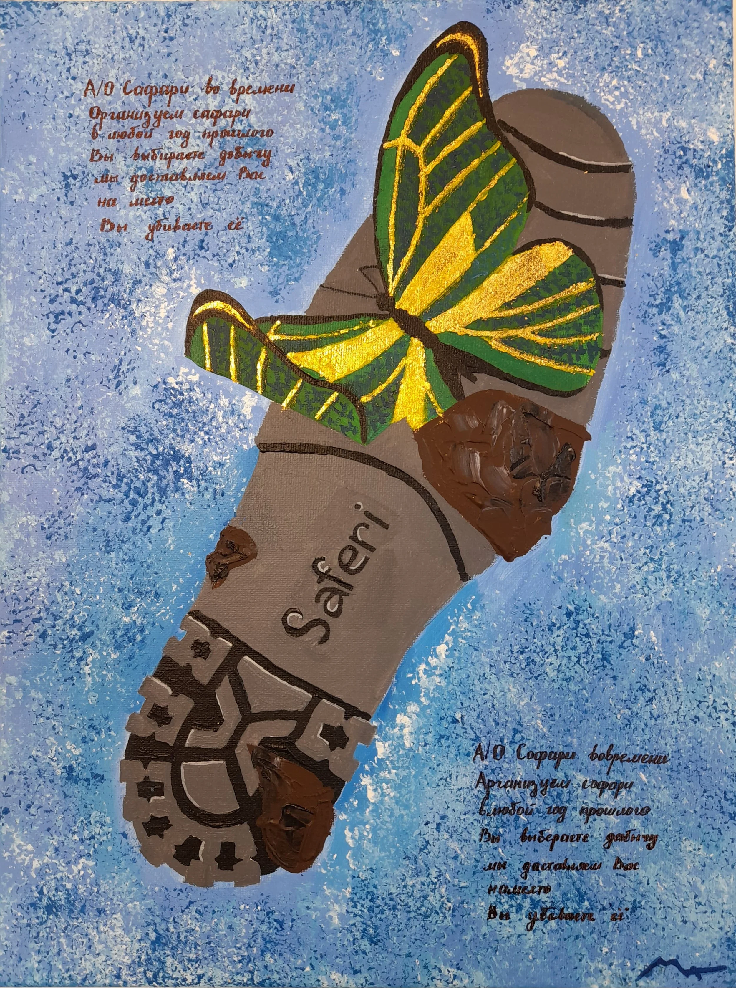 My work moves between painting, botanical sculpture, illustration, and the Japanese art of ikebana, weaving together nature’s quiet poetry and the hidden depths of the human soul. Each piece begins with a concept — often a single symbol — that I translate into a visual language layered with meaning. Butterfly draws its concept from Ray Bradbury’s short story A Sound of Thunder, where a single misstep transforms the entire course of history. In my work, the luminous green-gold butterfly lies crushed under the print of a safari boot, surrounded by fragments of advertising slogans from the fictional time-travel company — shown both before and after the fateful journey. This shift from order to distortion, with misspelled words and altered names, becomes a visual metaphor for the butterfly effect. The piece reflects on how small, seemingly insignificant actions can unravel the delicate threads of our reality. Through the stark contrast between beauty and destruction, Butterfly becomes a meditation on fragility — not only of life, but of history itself. It invites the viewer to consider how easily the world we know can change forever. Like El Greco’s figures, which stretch beyond the confines of their time and place, the butterfly reaches toward something unseen — a frequency of hope, an opening to the infinite. Through this work, I invite the viewer to pause, to feel, and perhaps to glimpse the moment of becoming.